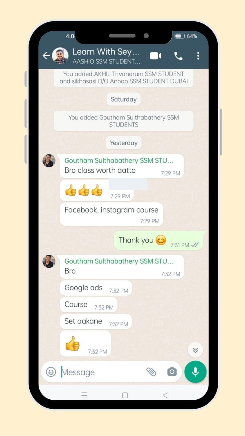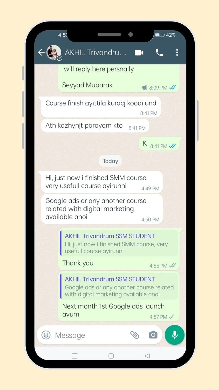 ഡിജിറ്റൽ മാർക്കറ്റിംഗ് രംഗത്ത് 8 വർഷത്തിലധികം പ്രവർത്തന പരിചയമുള്ള വ്യക്തിയാണ് ഞാൻ. ഈ കാലയളവിനുള്ളിൽ, 1000-ത്തിലധികം വിദ്യാർത്ഥികൾക്ക് ഞാൻ ഡിജിറ്റൽ മാർക്കറ്റിംഗ് കോഴ്സുകളിൽ പരിശീലനം നൽകിയിട്ടുണ്ട്. സങ്കീർണ്ണമായ കാര്യങ്ങൾ പോലും ലളിതമായ ഉദാഹരണങ്ങളിലൂടെ മനസ്സിലാക്കിക്കൊടുക്കുക എന്നതാണ് എൻ്റെ പ്രധാന ശൈലി. വെറും തിയറിയല്ല, ലൈവ് പ്രൊജക്റ്റുകൾ ചെയ്തുകൊണ്ടുള്ള പരിശീലനമാണ് ഞാൻ നൽകുന്നത്. ഇത് എല്ലാവർക്കും, പ്രത്യേകിച്ച് തുടക്കക്കാർക്കും, വിഷയങ്ങൾ എളുപ്പത്തിൽ മനസ്സിലാക്കാനും പ്രൊഫഷണലായി പ്രാവർത്തികമാക്കാനും സഹായിക്കുന്നു. നിങ്ങളുടെ ഡിജിറ്റൽ മാർക്കറ്റിംഗ് യാത്രയിൽ ഒരു കൈത്താങ്ങായി ഞാൻ എന്നും കൂടെയുണ്ടാകും.